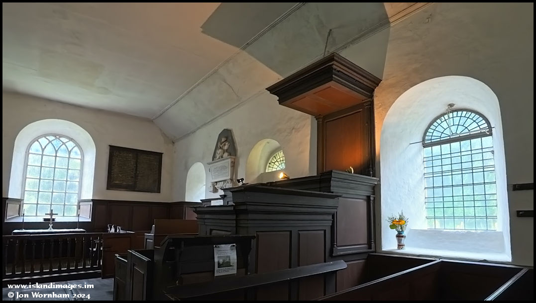 The unique (in the Isle of Man) triple decker pulpit in the old church. This eastern end was an extension constructed in the 1770s. I think that the mysterious door I mentioned earlier might be hidden beyond the pulpit in the picture.