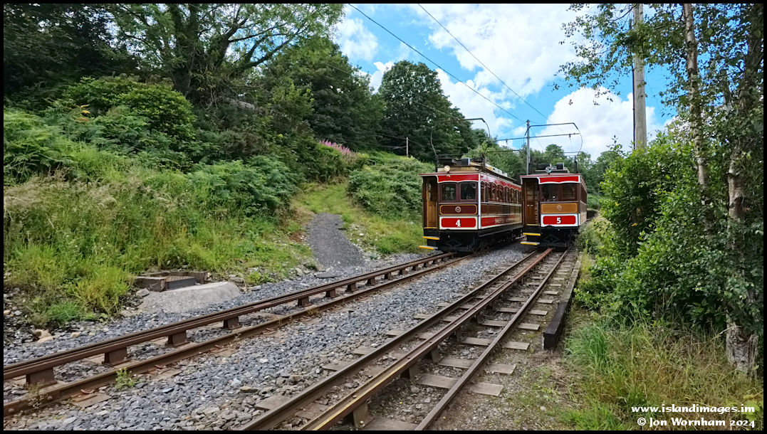 Although the Snaefell Mountain Railwy is double tracked over most of its length, it merges into a single line to cross the main road into the station. Now that Car 5 has departed, Car 4 can run down into the station.