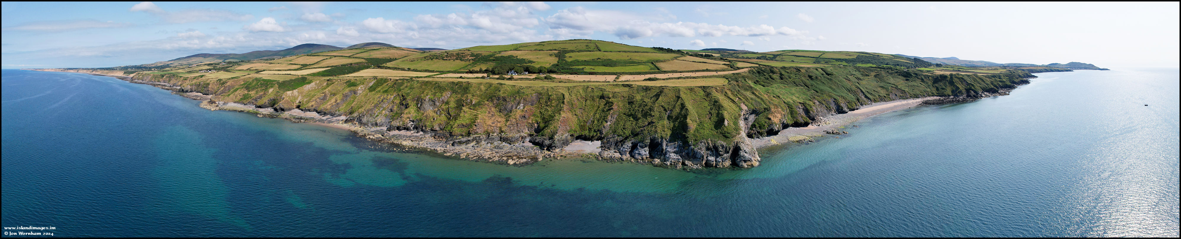 A stitched linear panorama centre just noth of Gob y Diegan, looking from Jurby head on the left then past Lady Port to Peel Hill and castle on the right.