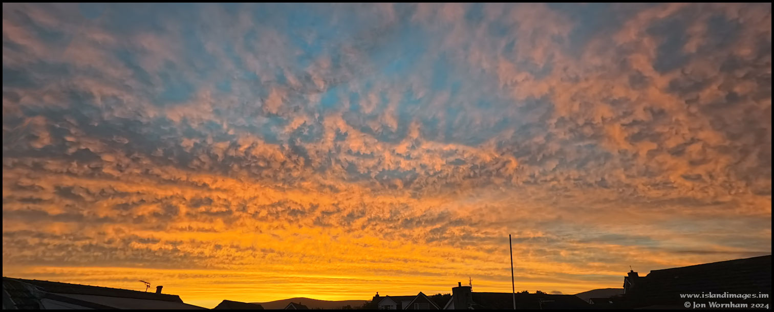 20:59 and the sun has set at ground level here, but is illuminating the lower edges of the clouds with some lovely orange colours. Looking north west through a Velux window in the roof.