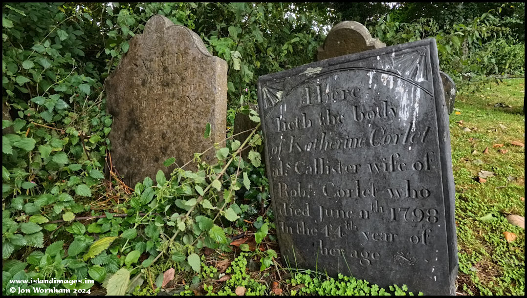A quite ornate slate gravestone for Katherine Corlet, who died 11th June 1798 aged 44.