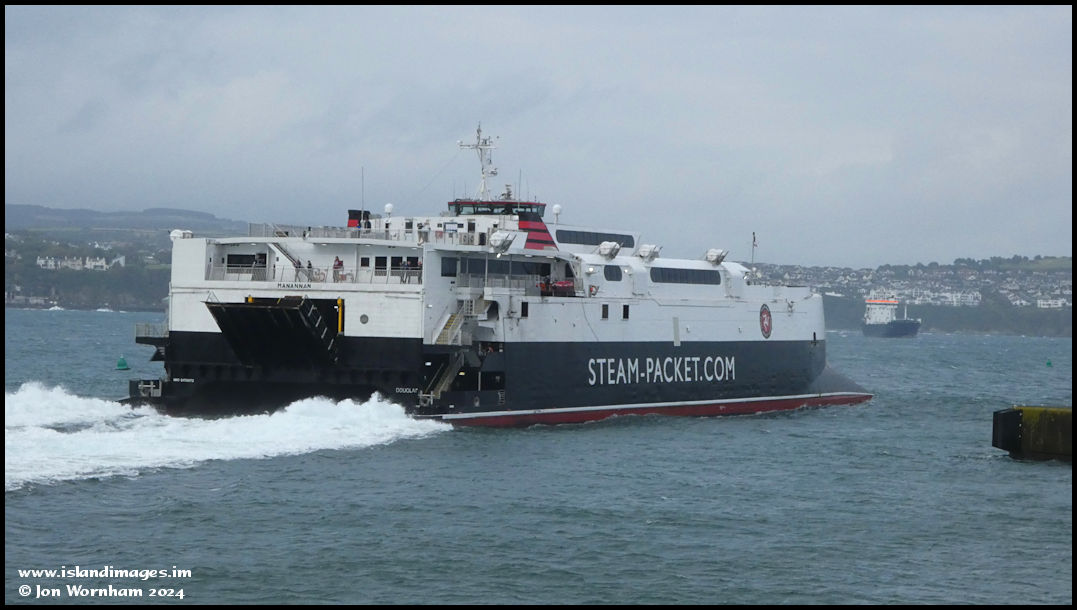 'Manannan' starts to pick up speed as she leaves the harbour, with 'Arrow' in the distance.