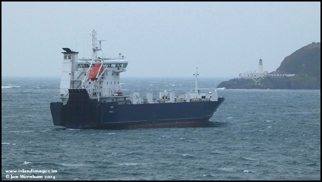 Zooming in for a closer look at the 'Arrow' with Douglas Head Lighthouse on the other side of the bay. 'Arrow' is a Ro-Ro frieght vessel and when not needed by the Steam Packet is chartered out.