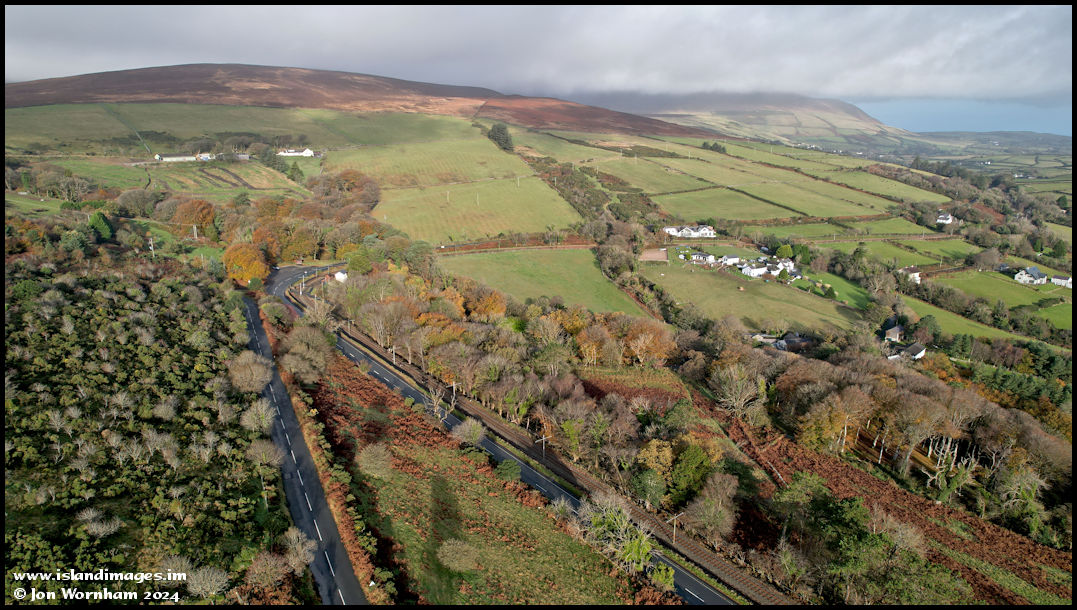 The top end of Dhoon Glen, where the road from Laxey curves over it. Low cloud is obscuring the summit of North Barrule at top right.