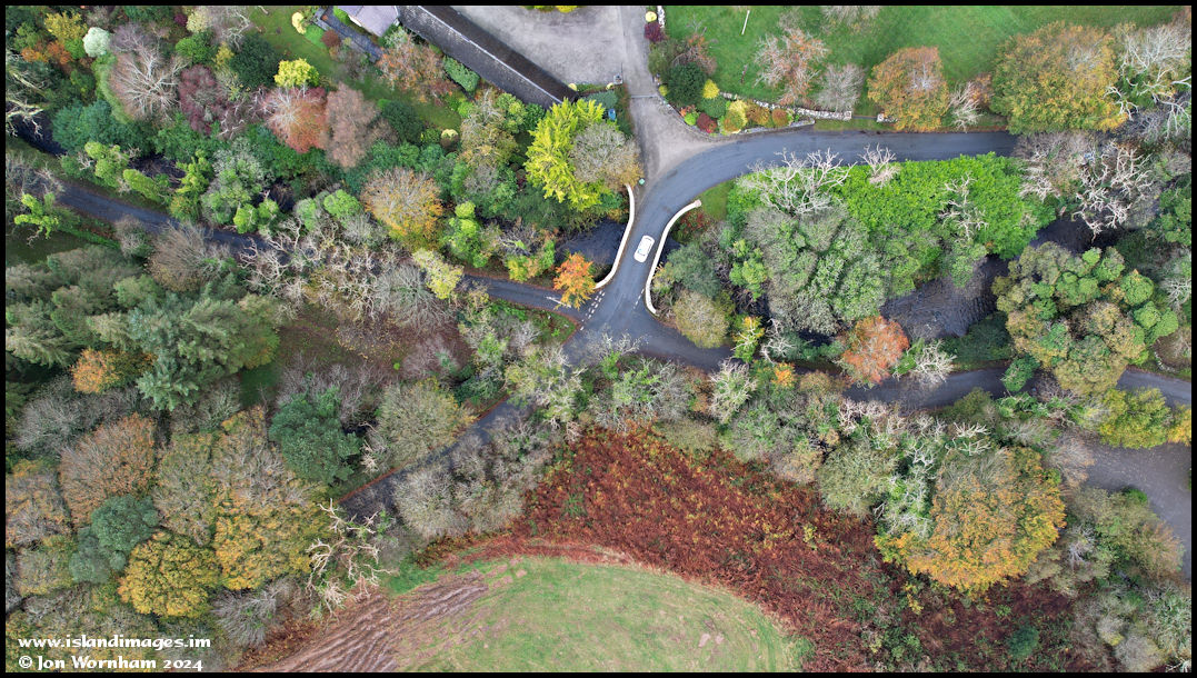 Looking verticall down to the crossroads just west of Tynwald Mills, and the narrow old bridge over the River Neb, which probably replaced a previous ford through the river.