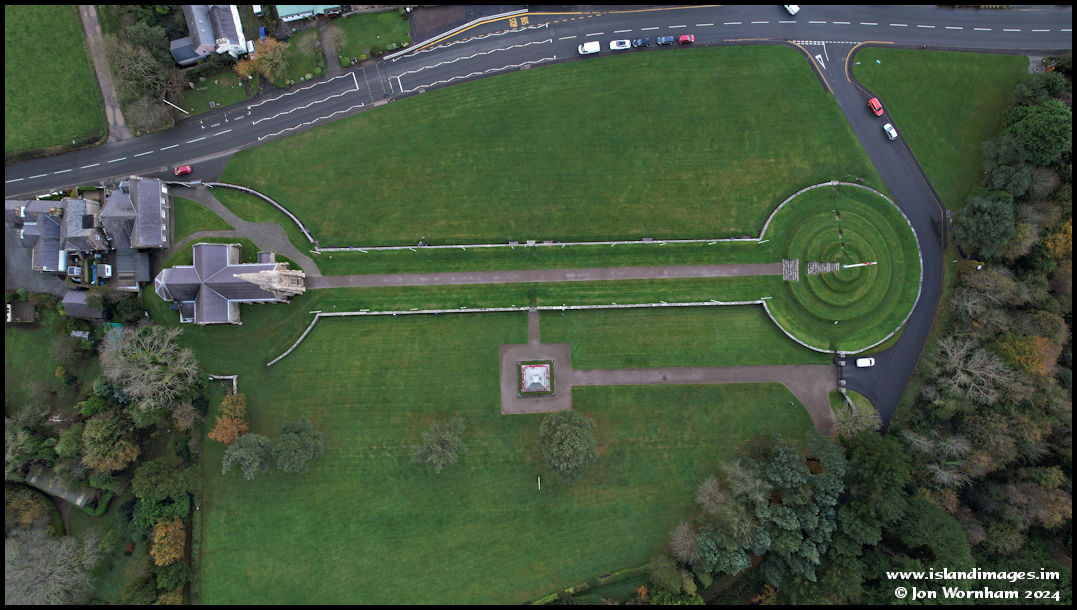 A near vertical look down to the processional walkway between St John's Church and Tynwald Hill