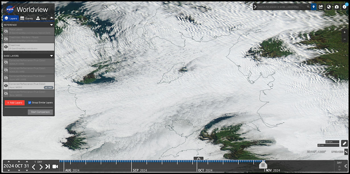 website showing the island covered in cloud apart from a small gap in the Ramsey area, downwind from Snaefell. Exact time of the Aqua satellite pass unknown.