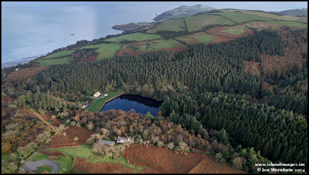 Ballure Reservoir, hidden away in the plantation, with Maughold Head in the distance.