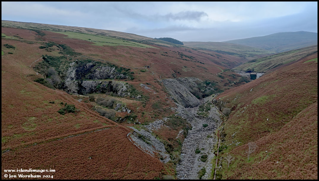 Flying a short distance up the Block Eary valley towards the quarry. When it's been raining a lot, there can be a spectacular waterfall at the back edge, but not even a sign of it today.