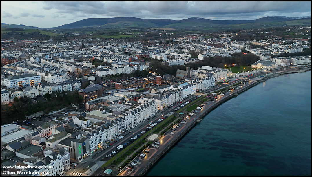 Looking north along the promenades towards the Gaiety Theatre and Villa Marina. There are still a few patches of snow on the hills in the distance.