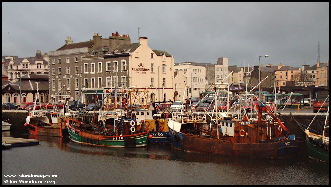 Christmas Eve in 2001 and local fishing boats are moored up on the north quay in the inner harbour, with the old Douglas Hotel and Clarendom Arms building behind, since replaced.
