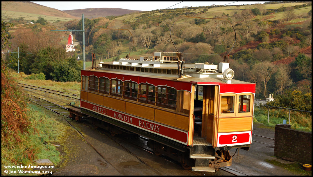 The fifteenth of December 2008 saw Snaefell Mountain Railway Car No 2 outside the depot on winter works duties, with the Laxey Wheel in the valley behind.