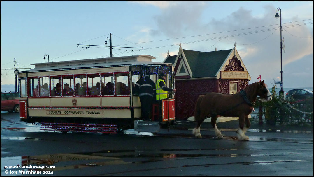 A Christmas time special on the Douglas Horse Tramway, in those days still being run by Douglas Corporation. Just leaving Derby Castle for the Sea Terminal on 17th December 2011.