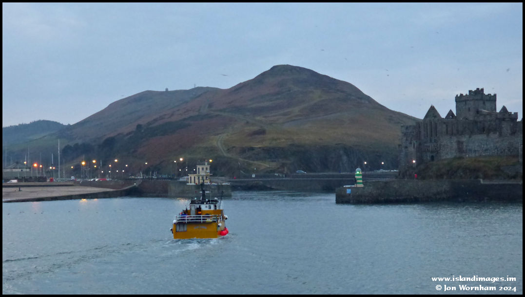 The 11th December 2013 and local fishing vessel 'New Dawn' approaches the harbour mouth at Peel, with Peel Hill and the original St German's Cathedral as a dramatic backdrop.
