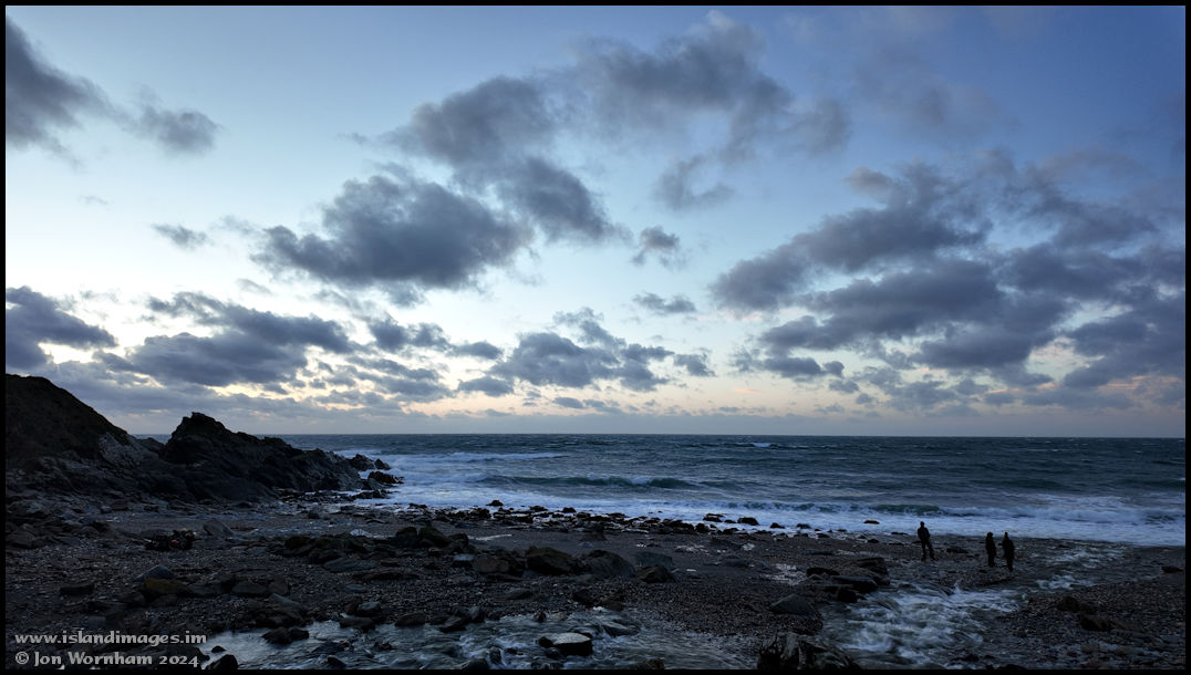 It's the 28th December 2023 and people are enjoying the beach at Glen Maye as sunset approaches.