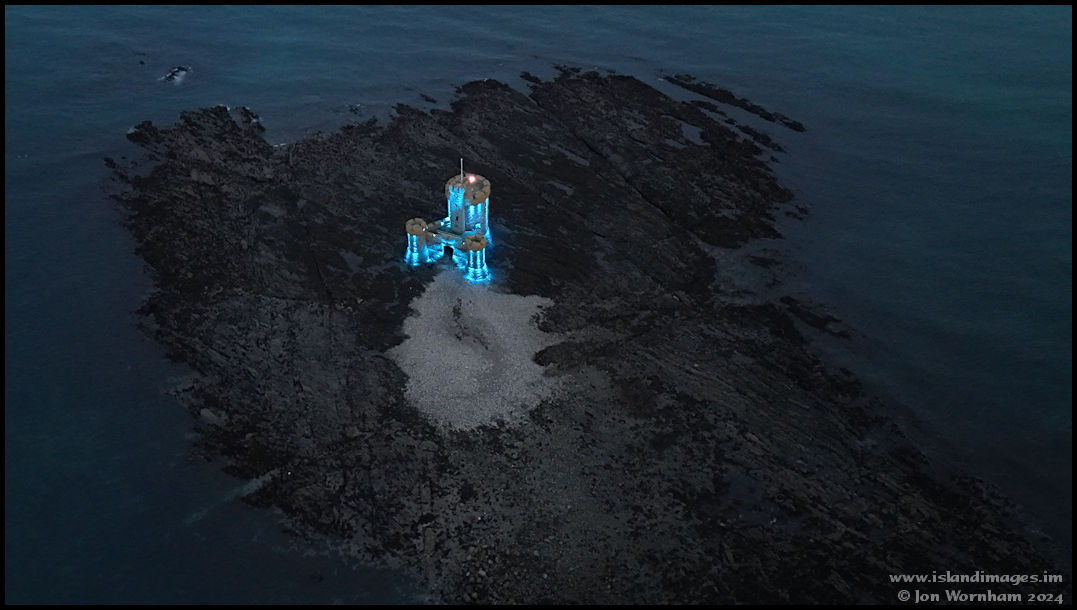 A semi-vertical view of the Tower of Refuge on the Conister Rock.