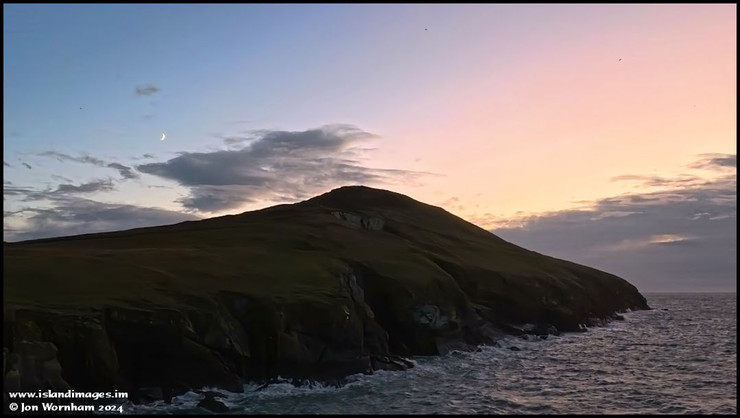 A crescent moon over Peel Hill around thirty minutes after sunset.