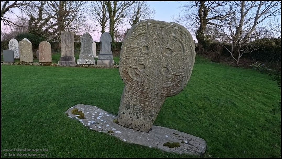 The 'Lonan Wheelheaded Cross' Thsi ancient cross stands in the chuchyard and probably was carved between 400 and 500 AD. It really is at this leaning angle, although probably exagerated by the wide angle lens on the Ace Pro camera.