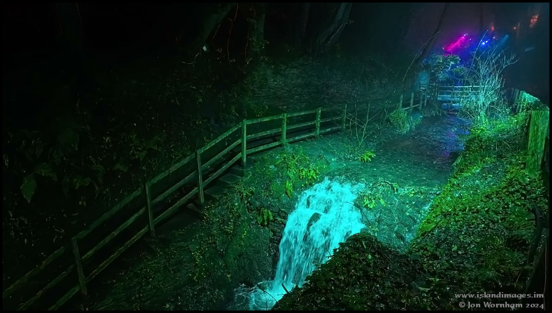 The waterfall featured near the start of my walk, now illuminated in green.