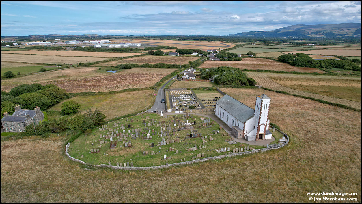 The second aerial shot from 2022 is looking east past the church and churchyards, with Jurby Airfield beyond.