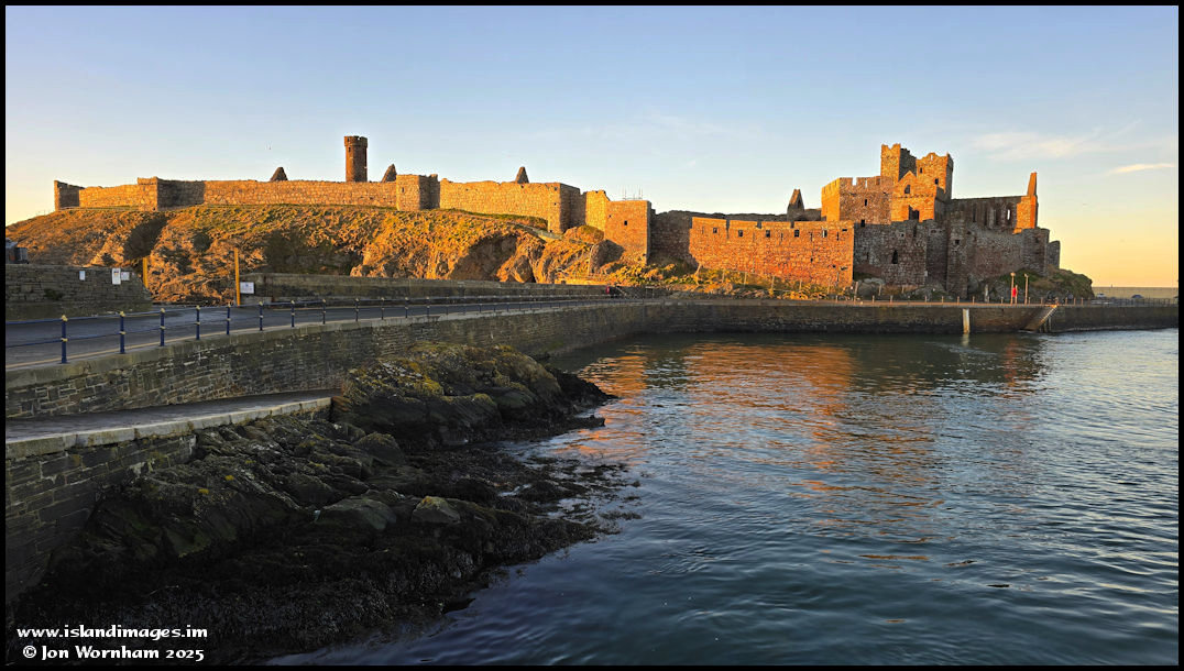 Peel Castle from by the (open) swing bridge. The reflections were disturbed by the small boat entering the inner harbour.