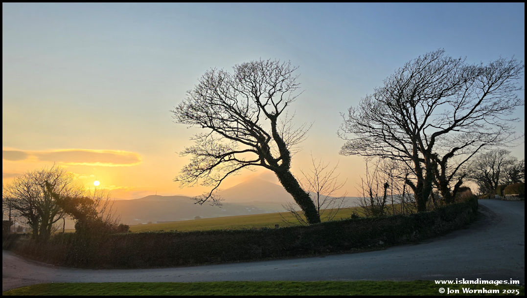 The sun is close to setting, viewed from the bend in the road in Maughold Village, with the tree neatly framing North Barrule.