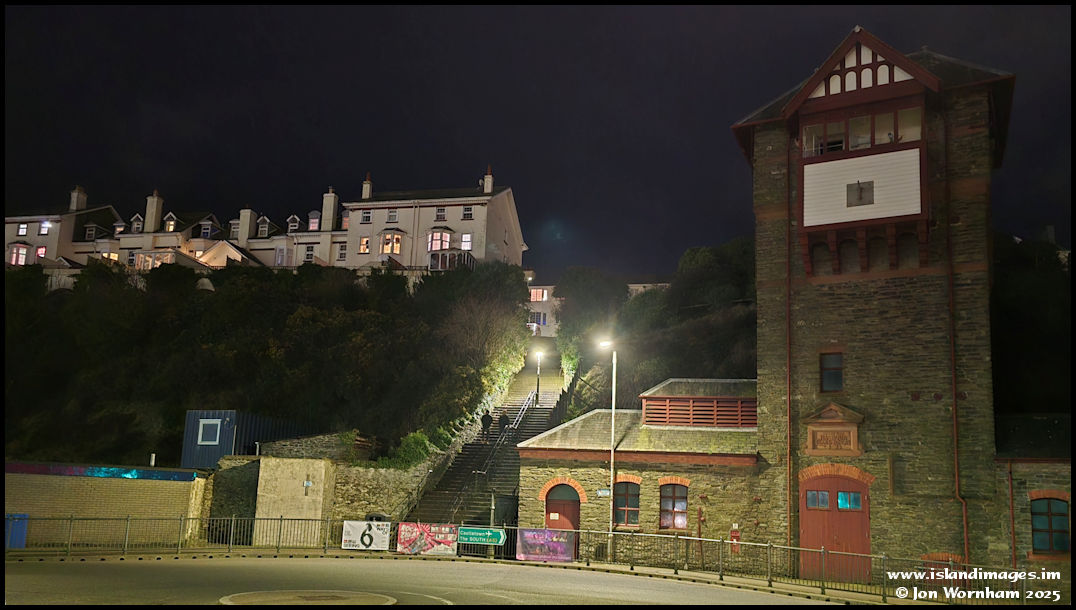 The control tower for the old harbour pedestrian only swing bridge, now replaced by the 'all traffic' lifting bridge. The steep steps lead up to Douglas Head Road.