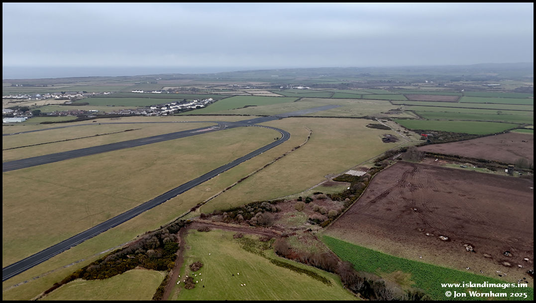 The eastern end of Jurby Airfield, where the main runway was extended across the Sandygate Road in the 1960s to allow the Vickers Viscount turboprop airlines of Cambrian Airways to operate here.