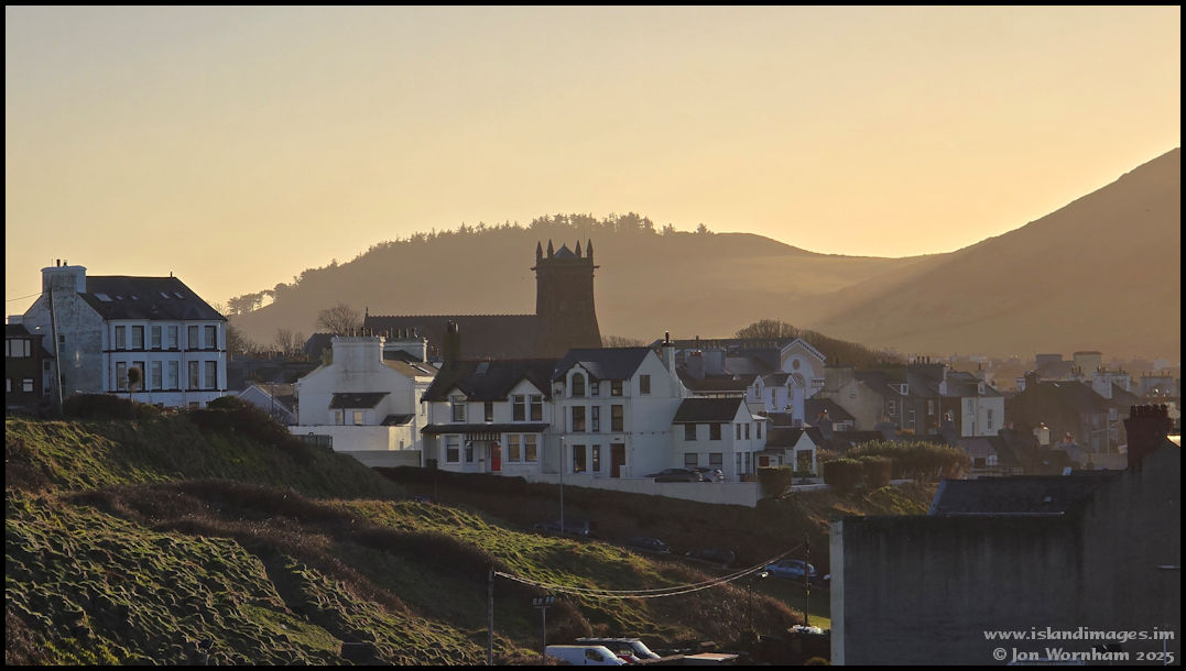 Looking back to the town from one of the headland footpaths, with St German's Cathedral sillhouetted against the hill at Knockaloe.