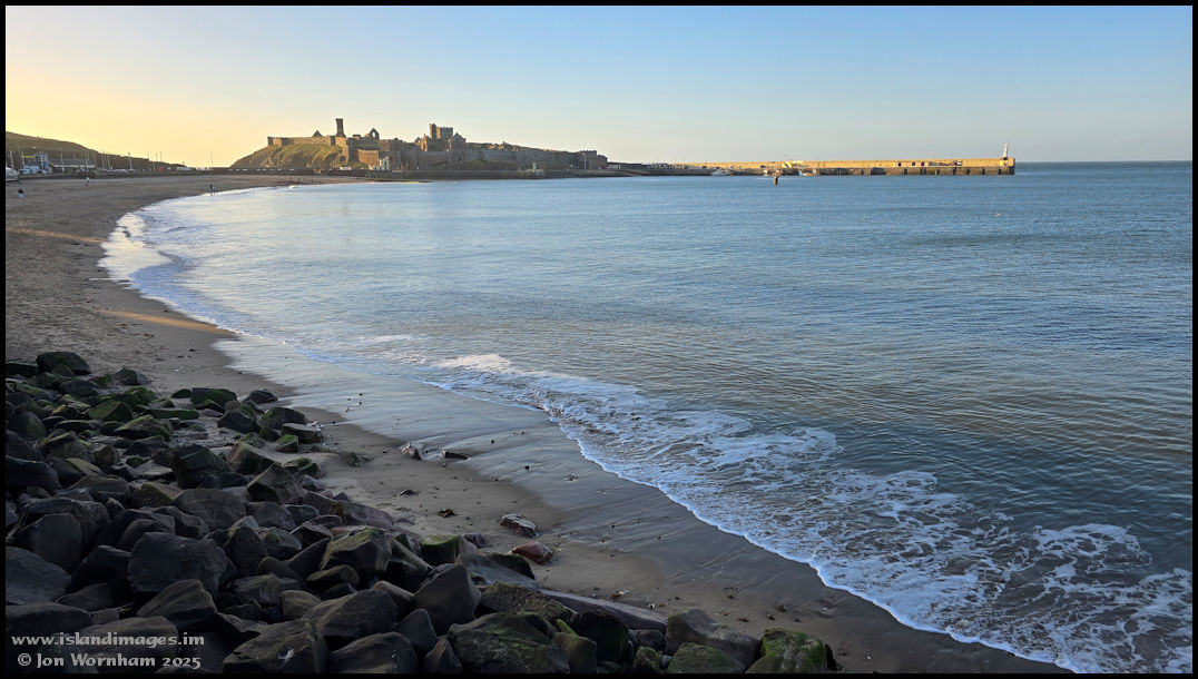 Walking back along the promenade towards the castle, with the sun setting behind Peel Hill from here.