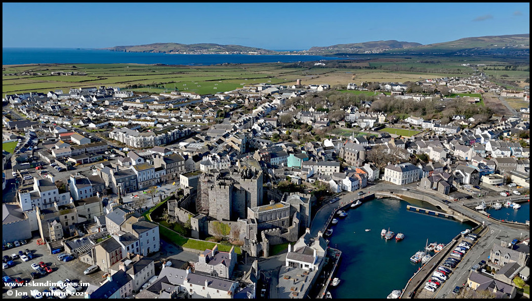 Getting the sun behind the camer for this view past Castle Rushen, then past the 'Witches Mill' on the outskirts of town and to Bay ny Carrickey with Port St Mary in the distance.