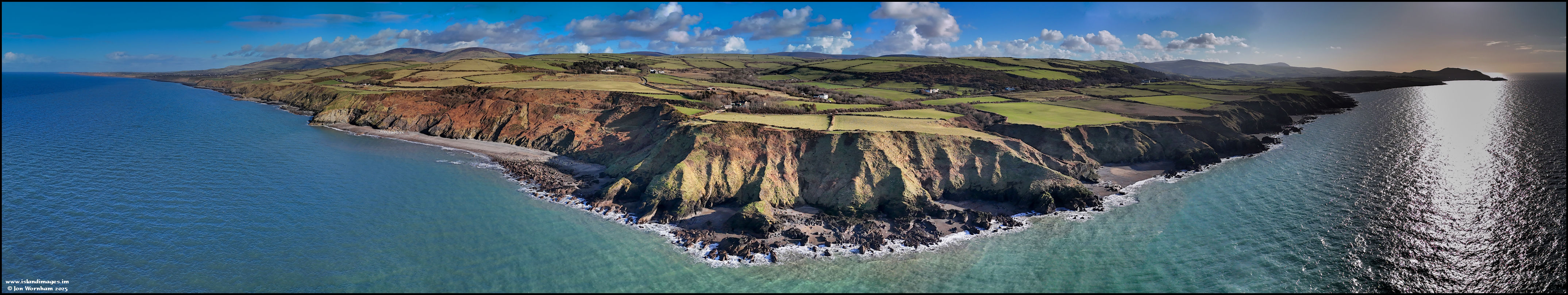 A stitched linear panorama at Lhiannag, looking from Jurby Head on the left to Peel Hill on the right.