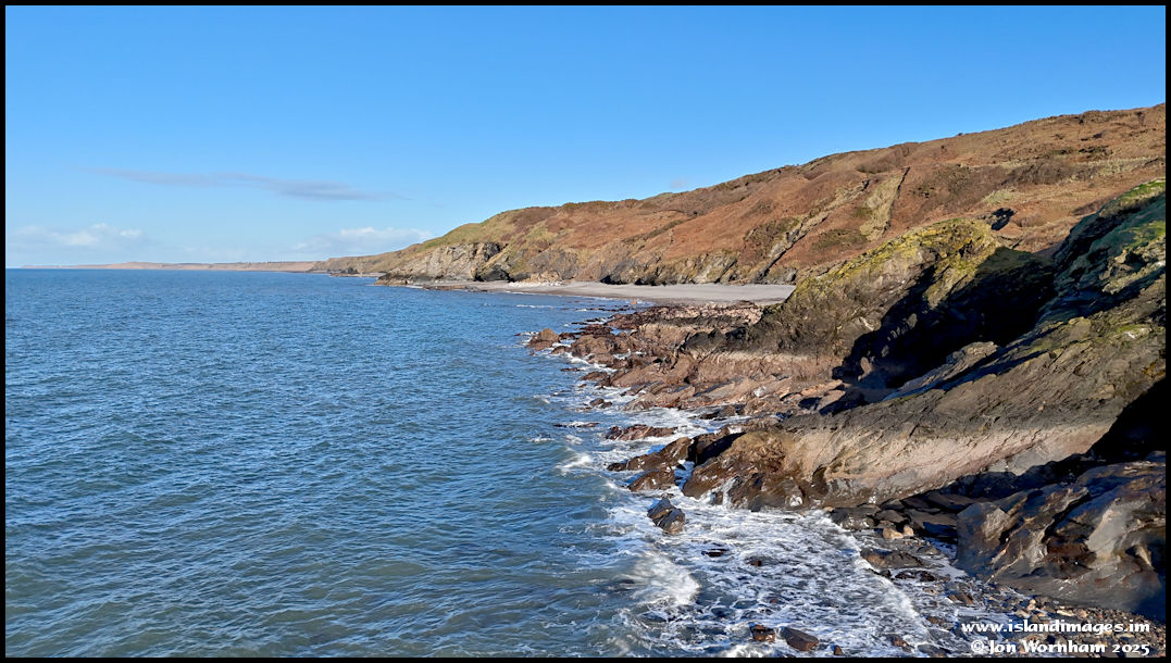 A low level view from over the sea, looking north with Jurby Head in the distance.