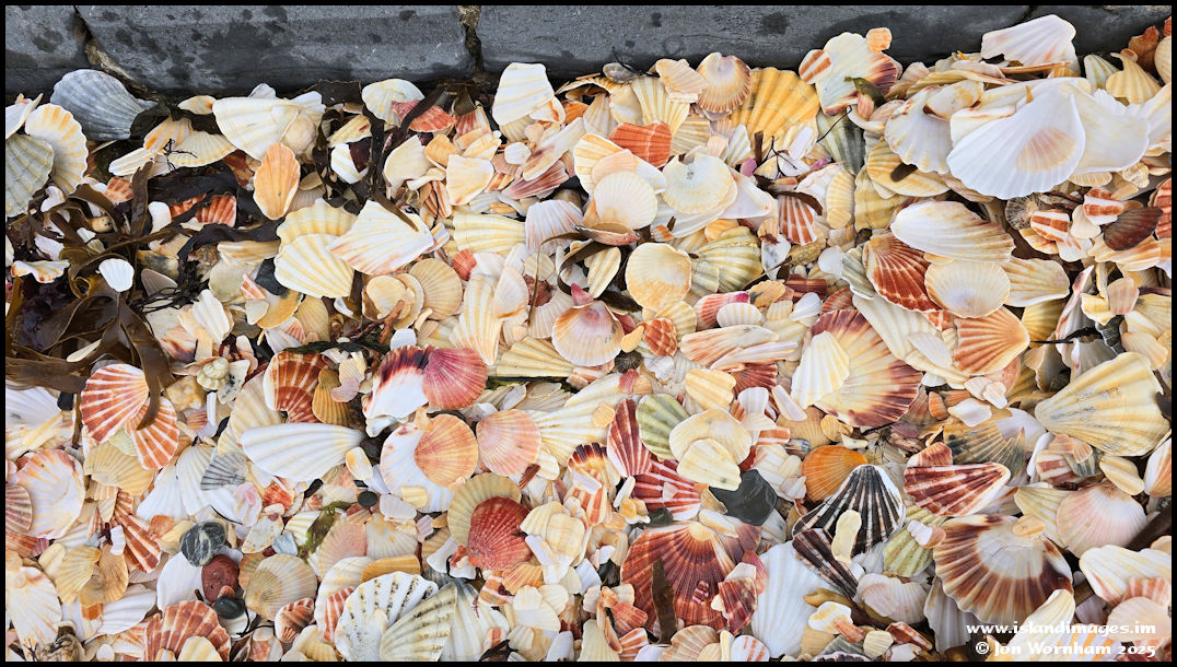 Shells at the back of the beach by the causeway. The shells are mainly scallops, a by-product of the fish processing plants in the town. They're tipped back into the sea from Peel Hill and the tides wash them onto Fenella Beach.
