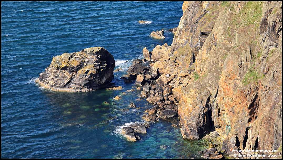 Looking down from the clifftops to the old North Bradda Mine engine house, tucked into a fold in the cliff just above sea level.