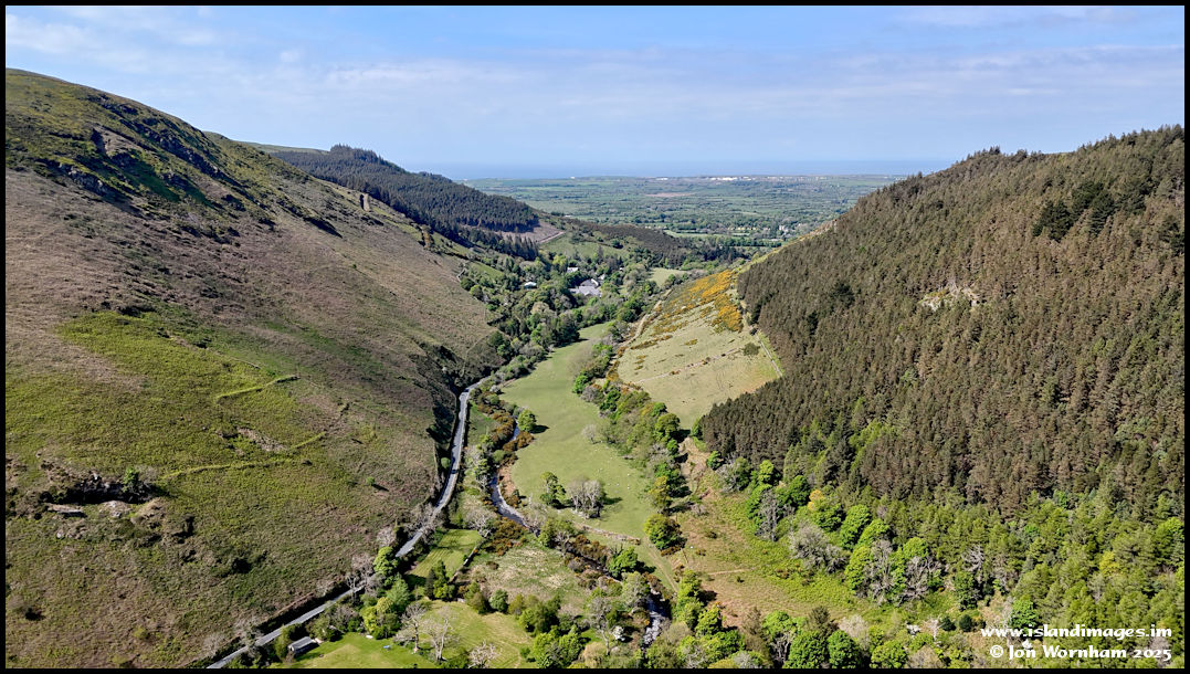 Looking to the north again as the Sulby River snakes around in the valley below. Ballakerka Plantation on the right, growing on the steep slopes of The Carrick.