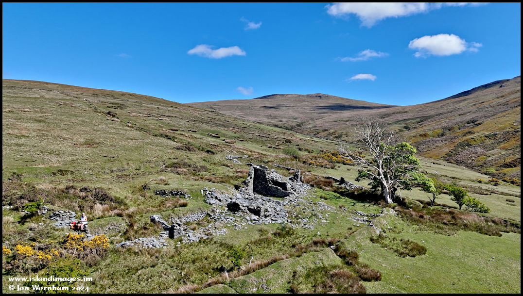 Taking the drone up into the air for a look across the crumbling remains of Block Eary, with Clagh Ouyr rising on the horizon.