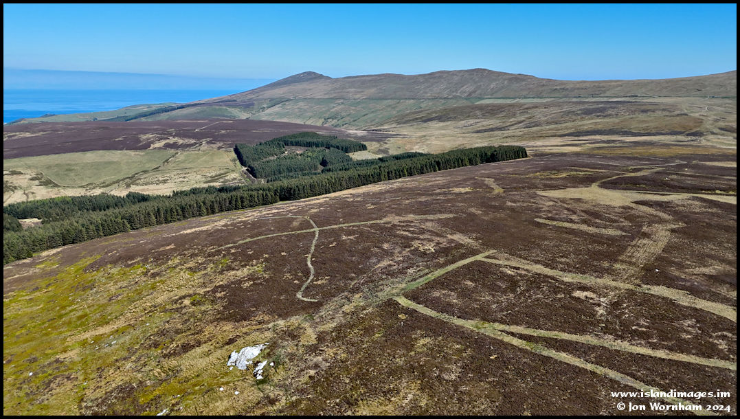 With the quartz outcrop of Greg Bedn in the foreground, then looking across the moorland to the North Barrule ridgeline, with the triskelion just below its summit standing out well.
