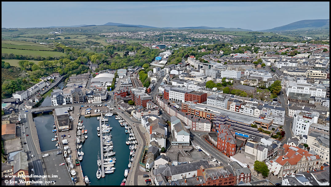 Lots to see in this picture looking over the top end of the harbour to the Steam Railway station. Lower right is Douglas Town Hall, with St George's Church in its little green area above.