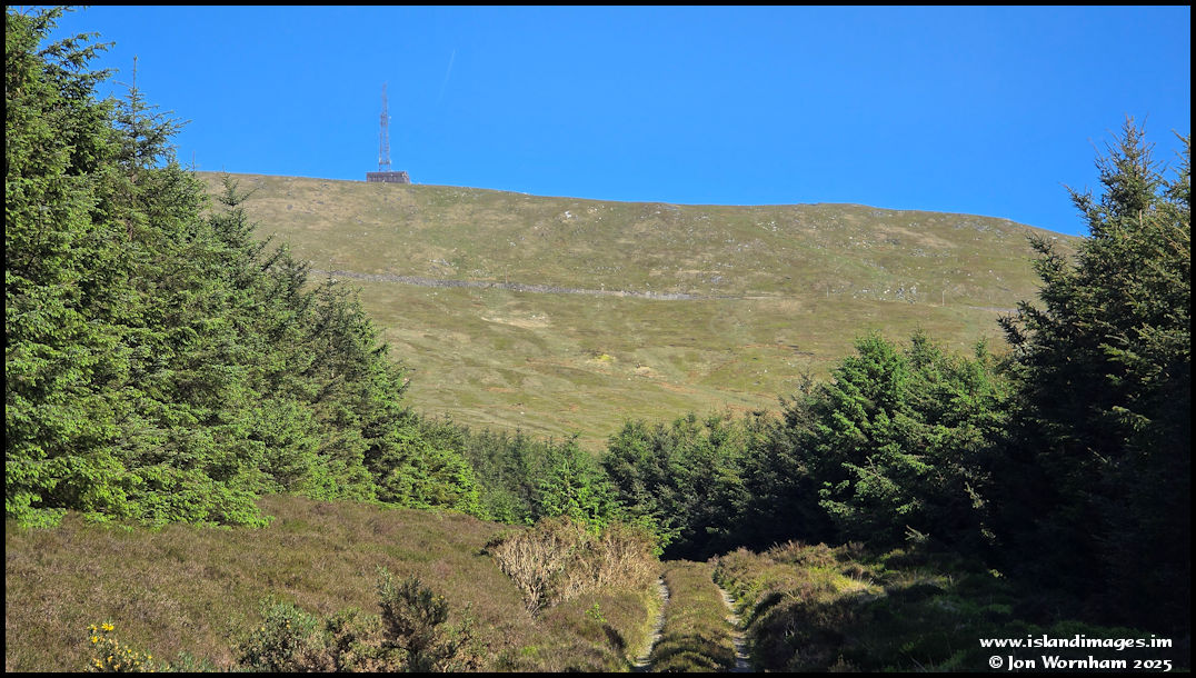 Walking back through the coniferous plantation, with the summit of Snaefell ahead.