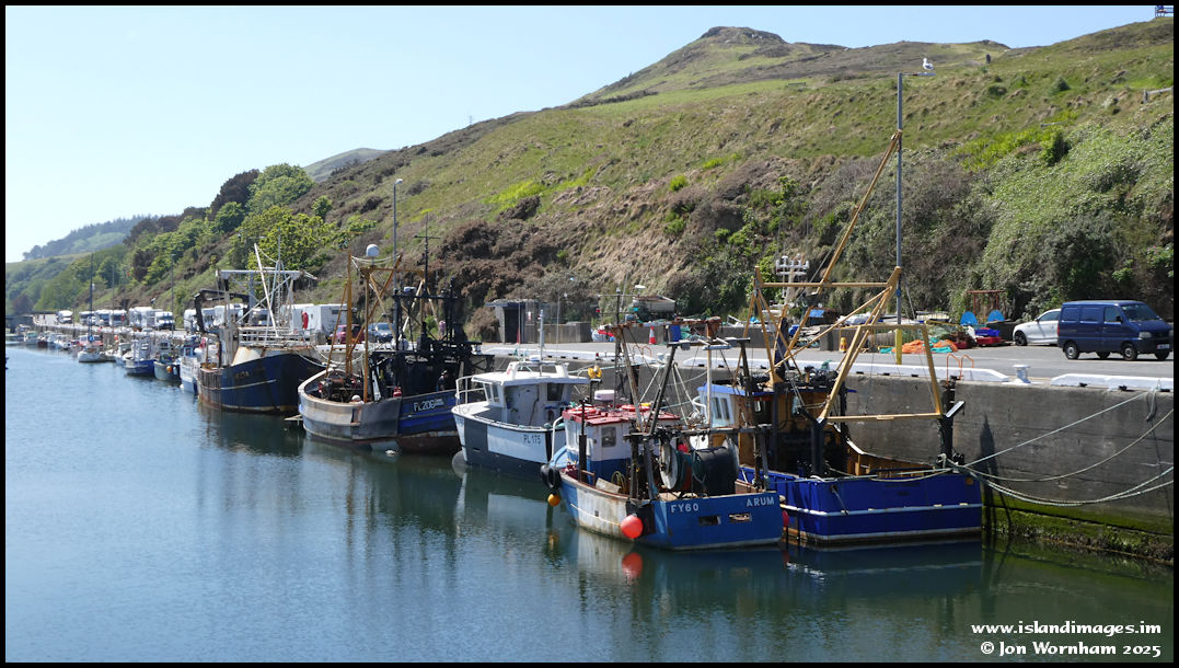 Fishing boats tied up at the west quay with Peel Hill rising behind.