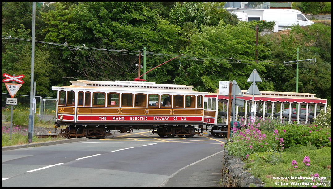 Car No 22 on the first of three road crossings before entering the station from Ramsey. Only a few seconds before I took this picture, a car and a van had driven straight across in front of the tram.