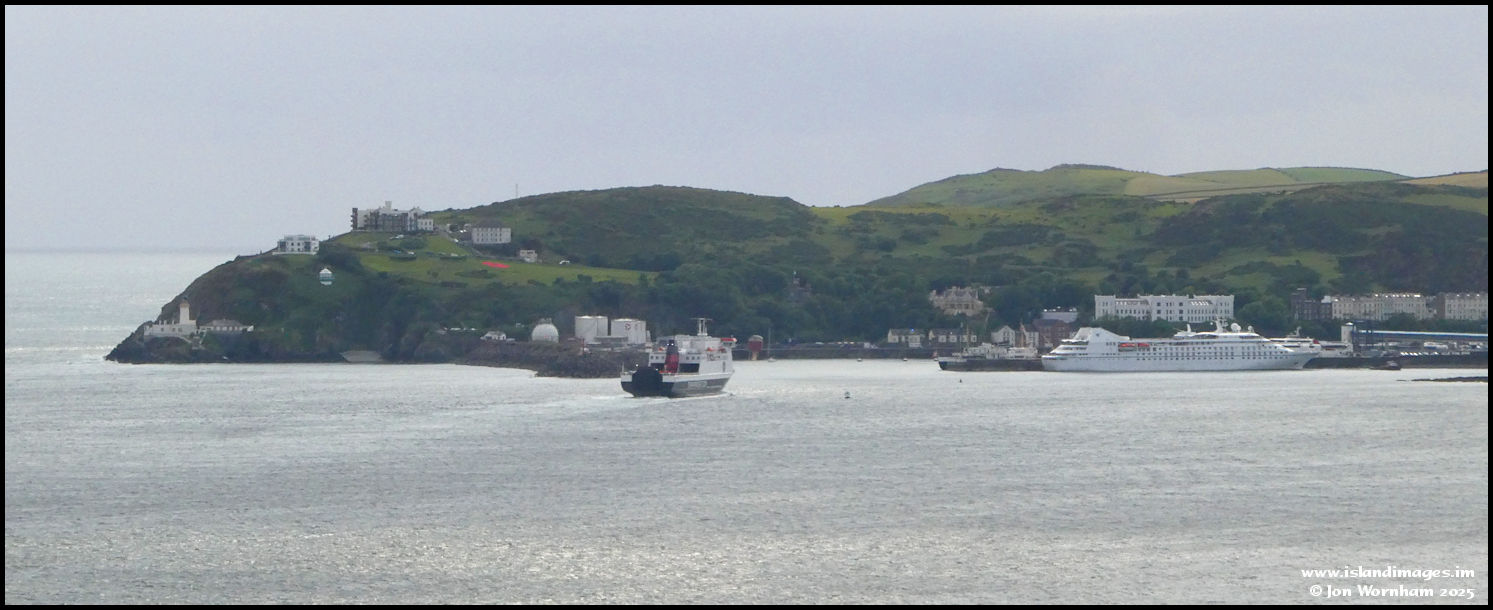 This final picture was looking across the bay to Douglas Head, where the 'Ben my Chree' is about to enter harbour, as cruise ship 'Star Legend' waits to set sail from the Victoria Pier, with the assistance of tug 'Wendy Ann'.