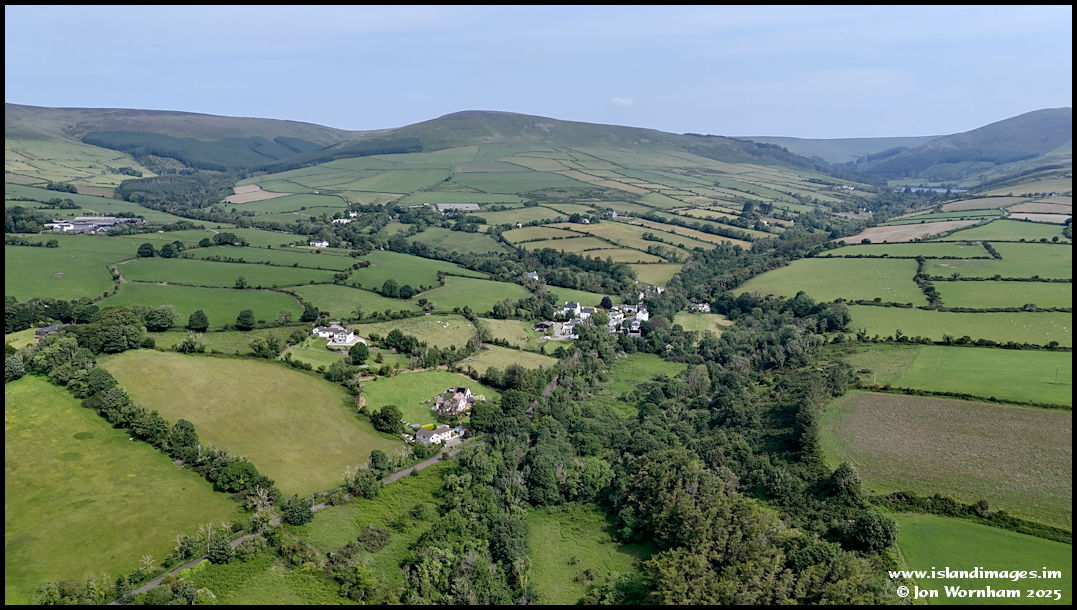 The scattered houses of West Baldwin village with Injebreck Reservoir just visible towards the top right of the picture. The River Glass rises in the hills beyond that.