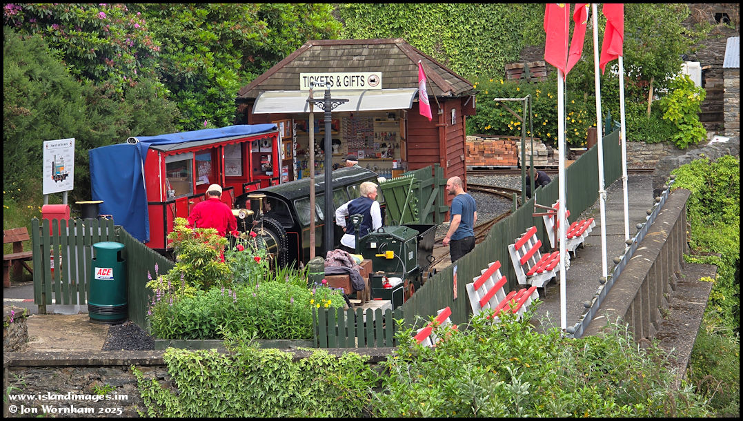 Looking down to the Great Laxey Mine Railway's station just below road level.