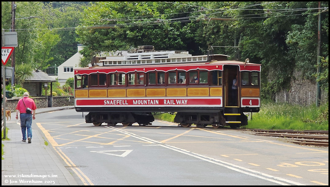 Snaefell Mountain Railway Car No 4 crosses the main road on its journey down from the summit.