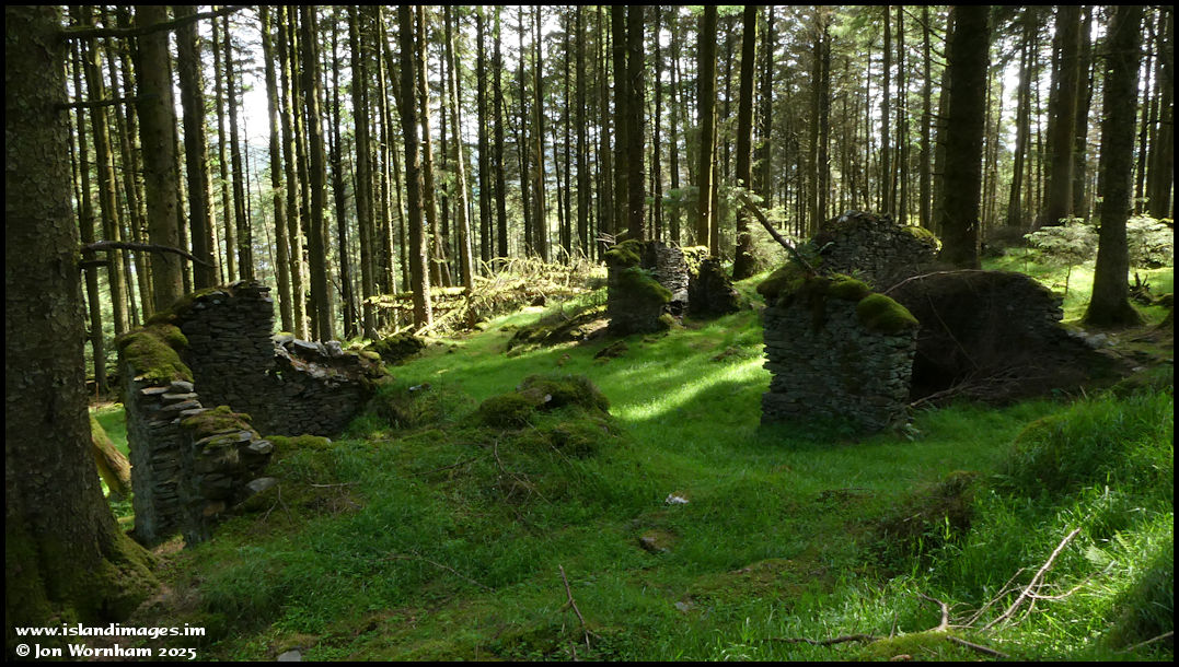 Sunlight filters through the trees around the ruins of Sharragh Bedn farm, one of a large number of abandoned hill farms in this area.
