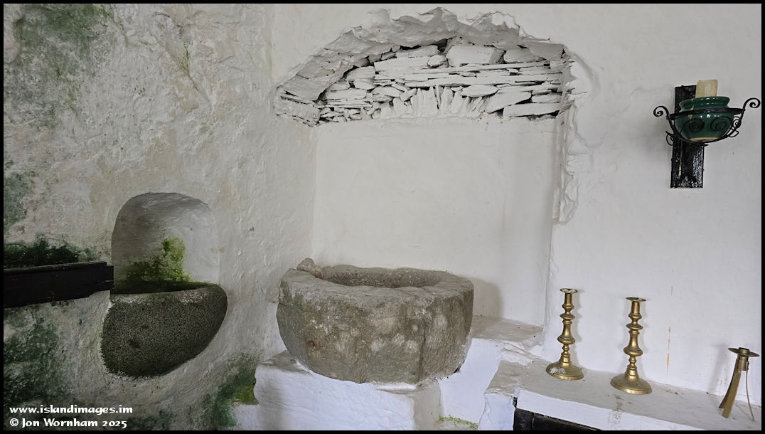 At the western end of the north wall, there are two baptismal fonts. The stone arch above the larger one is the feature that can be seen on the outside of the wall - window or doorway?