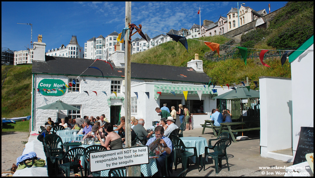 Port Erin on the 13th July 2008, with lots of customers enjoying food at the Cosy Nook Cafe, with the gent in the foreground getting his 'news' from The Sun!