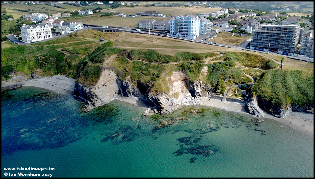 An aerial shot of the three smaller beaches at Port Erin on the 25th of July 2021 with some lovely turquoise shades from the clear sea waters.
